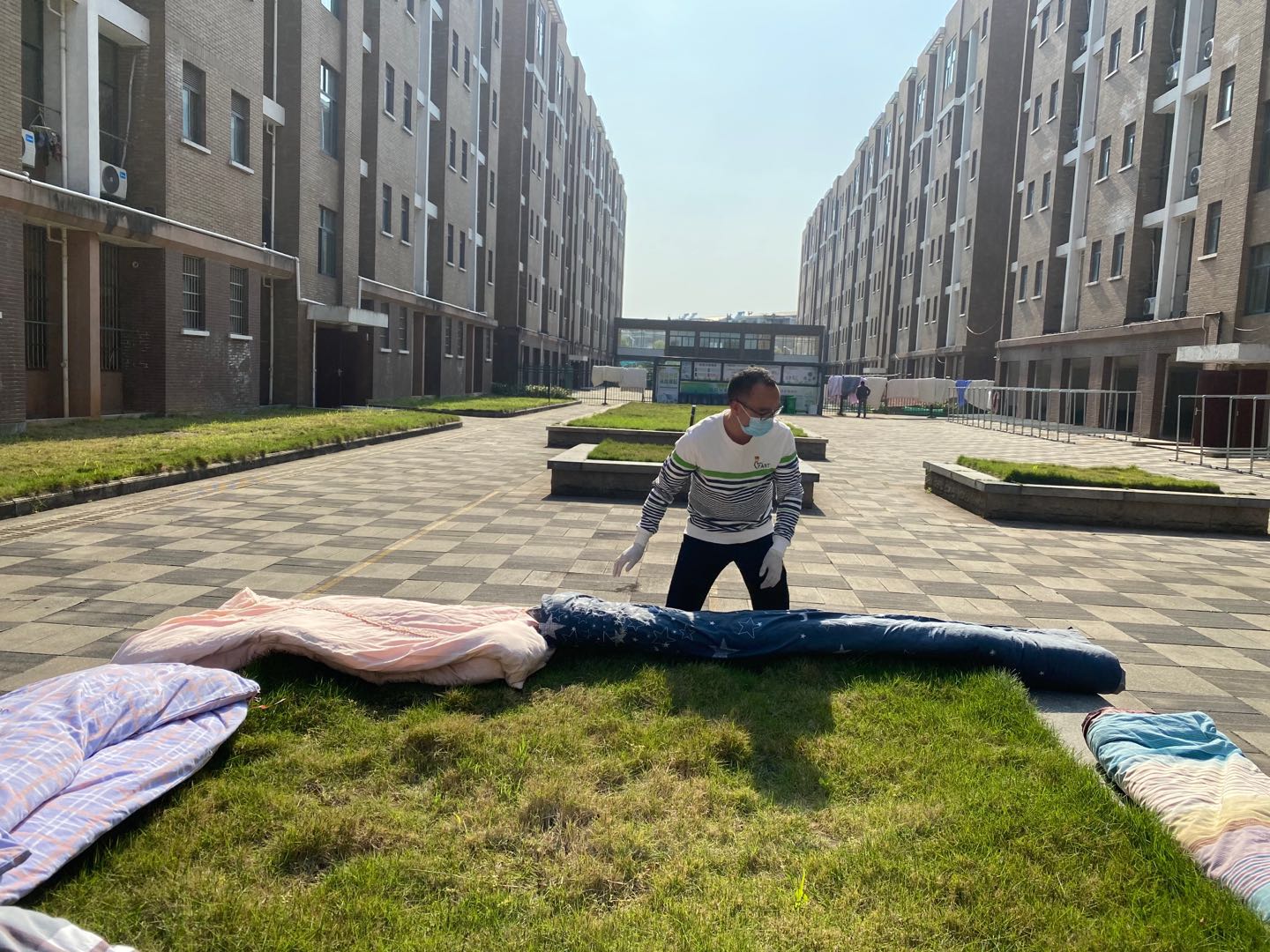 4月28日,艳阳高照,一大早,大家就来到学生宿舍,认真核对每位学生晒被宿舍楼号、寝室号、床位号,贴标签,搬被子,大家分工合作,齐心协力,在大好的阳光沐浴下,一条条五颜六色的被子挂满了整栋宿舍晾衣架,场面十分“热闹”。大家干得热火朝天,汗流浃背,待被子蓬松了再收回叠好,已经是下午五点多了。