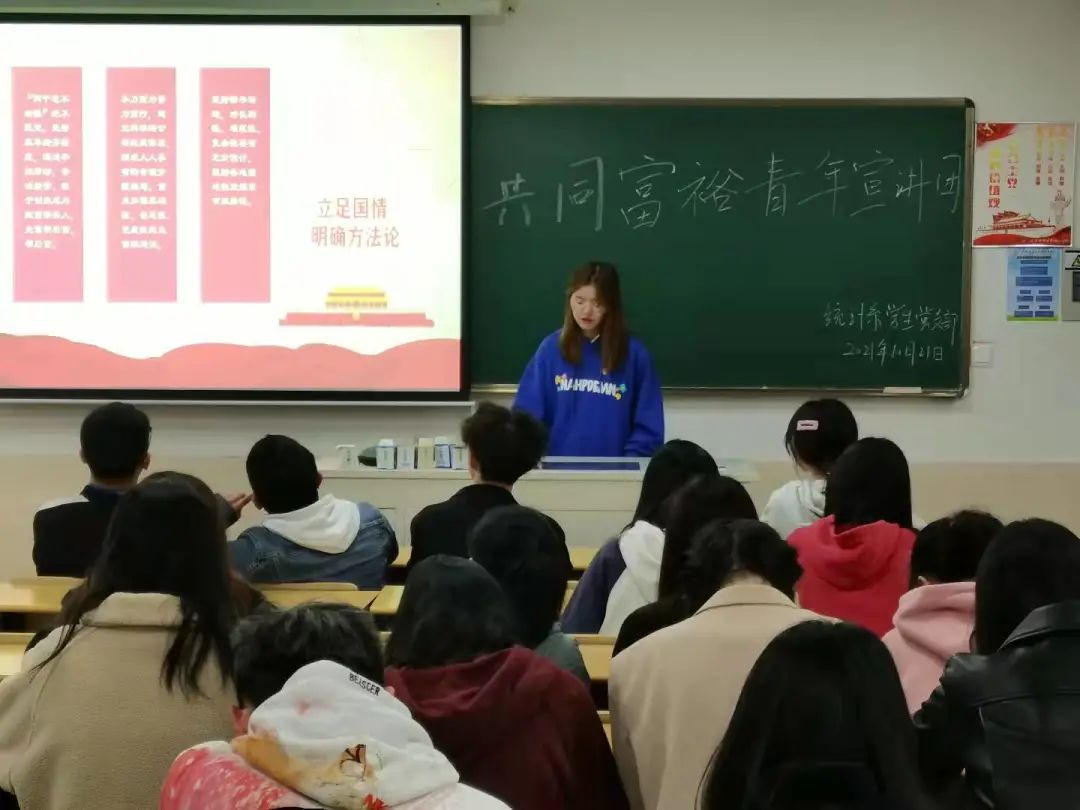 我系学生党支部“青年宣讲团”至各支部,以“共同富裕”为主题进行宣讲。告诫当代青年人应当不忘寄托,用初心促改革,以改革催奋进,为共同富裕的发展托举未来,贡献青春力量。